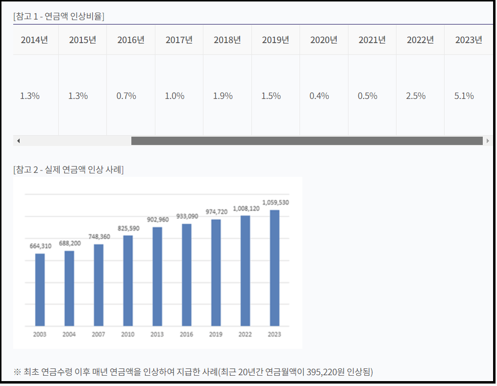 2023년 5.1% 인상(최근 20년간 연금월액이 395,220원 인상됨)