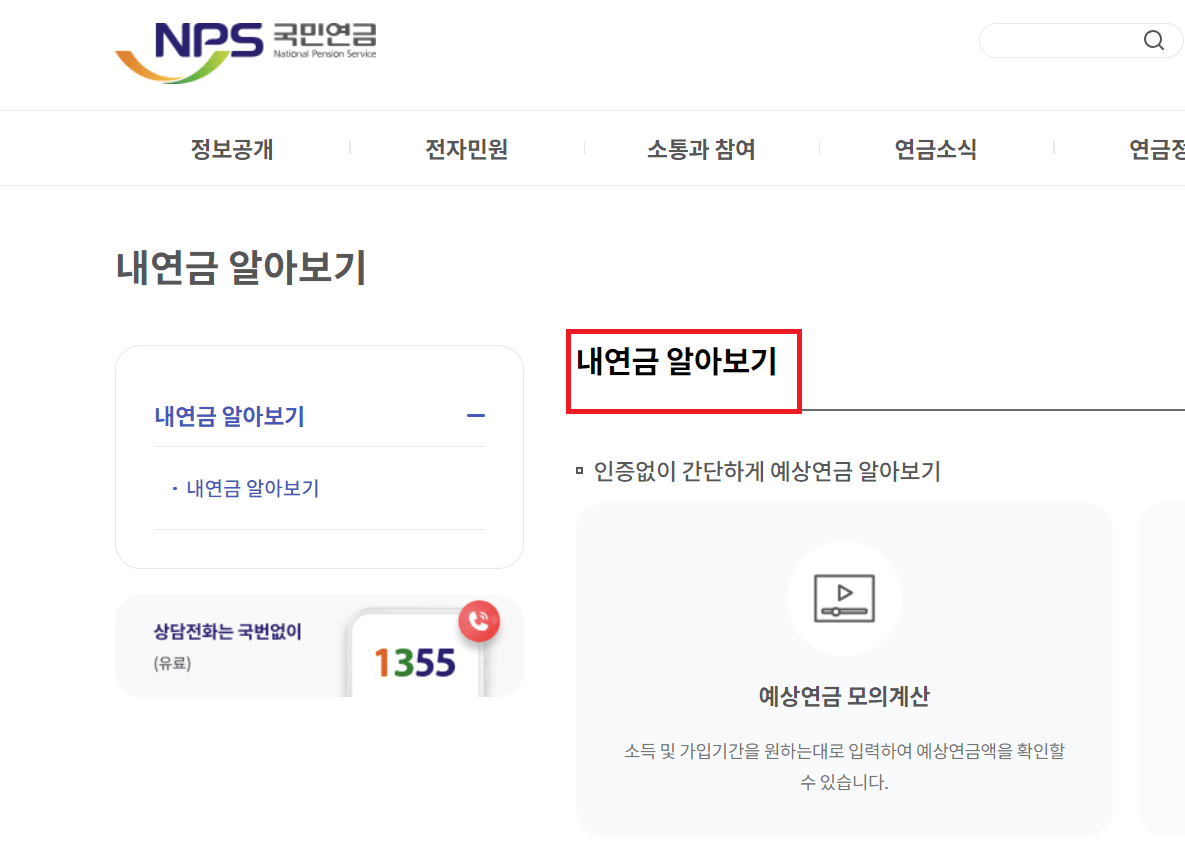 국민연금홈페이지 접속→ 자주 찾는 서비스→내연금 알아보기