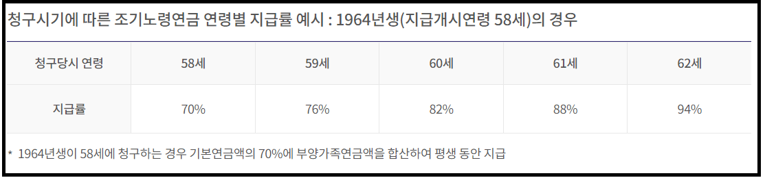 아래표에 나온 것처런 본래 1964년생 63세가 수급연령인데 5년 일찍 연금을 받게되면 매년6% 지급률이 감소하며, 58세 조기 수령하게되면 최대 30% 감액받게 된다는 것을 알 수 있습니다.