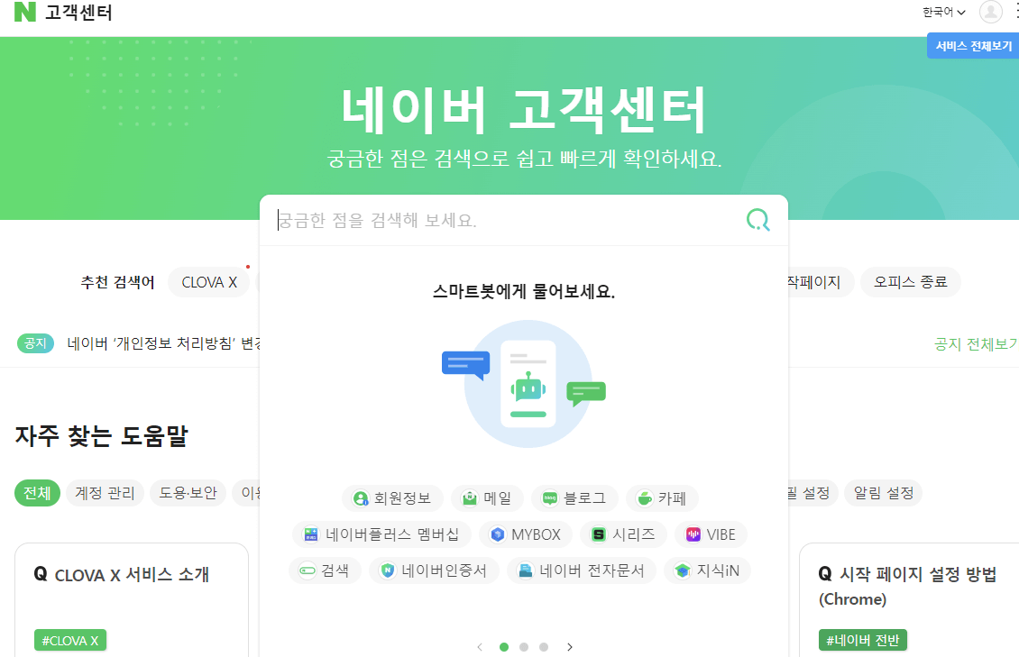 네이버 홈페이지 접속 후> 스크롤 맨 아래 내리면 다음과 같은 고객센터 있음> 고객센터 클릭하면 다음과 같이 '스마트봇 이용하기'가 있습니다.