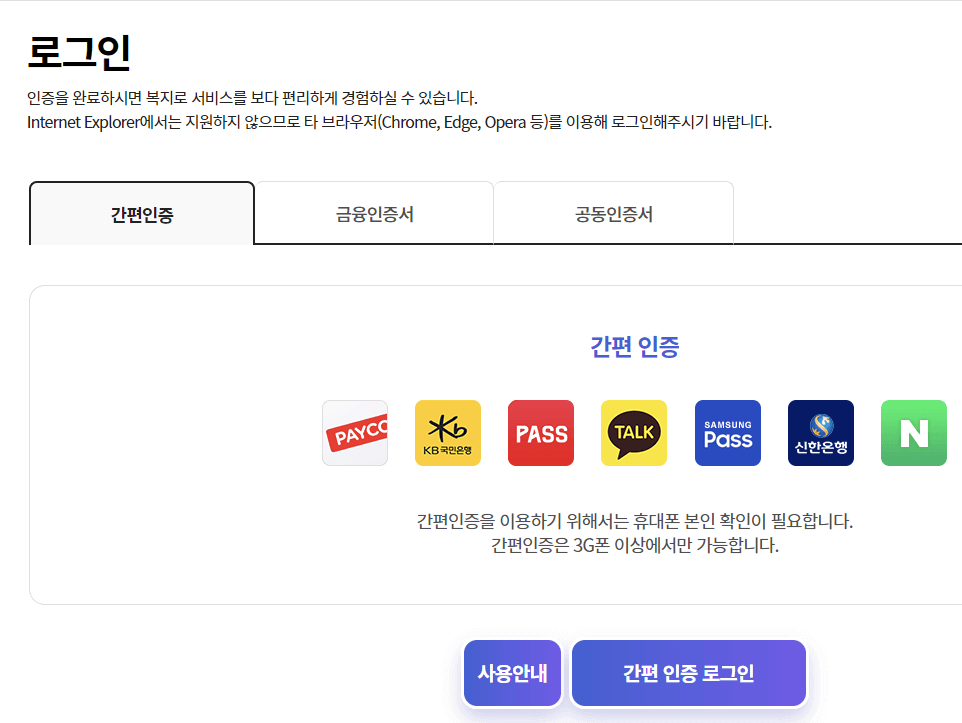 금융인증서나 공동인증서가 없더라도 간편 인증(민간인증) 방법으로 카카오톡, 네이버, PASS 앱을 사용해서 간편 인증 로그인을 진행하실 수 있습니다.