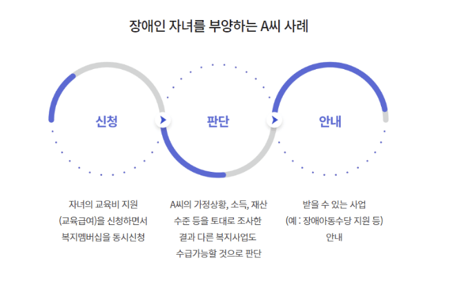 복지수급을 희망하는 개인이나 가구의 연령, 가구구, 경제상황을 기준으로 받을 수 있는 복지서비스 맞춤형으로 찾아서 안내해 주는 제도입니다.