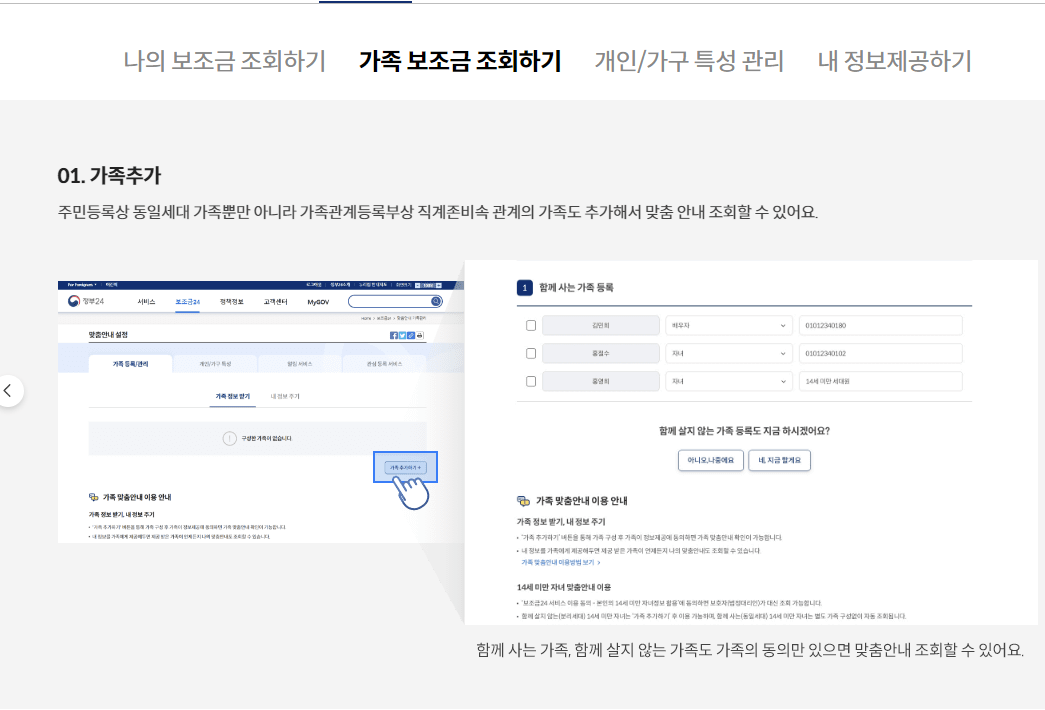 14세 이상 가족 구성원이 사전 동의만 하면 내 정보는 물론 동일 세대 가족의 혜택도 알 수 있고, 따로 살고 있는(분리세대) 가족의 보조금도 알 수 있습니다.