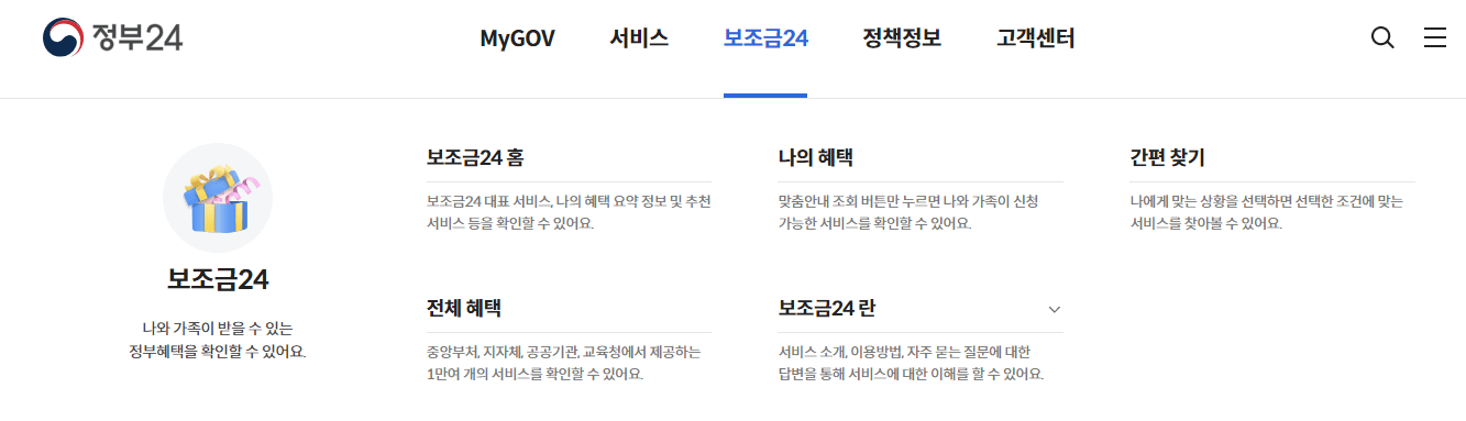 정부 24가 운영하는 서비스의 일부인 '보조금 24'는 정부 보조금을 한 번에 확인하고 신청할 수 있는 서비스입니다. 국가의 다양한 지원금을 한 곳에 모아놓은 서비스로 나와 가족에게 맞는 정부 지원금을 확인하고 신청할 수 있는 맞춤형 서비스입니다.