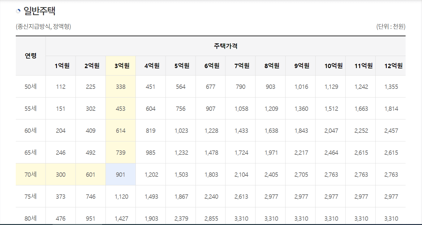 예시)70세(부부중 연소자기준) 3억 원 주택 기준→매월 90만1천원 수령