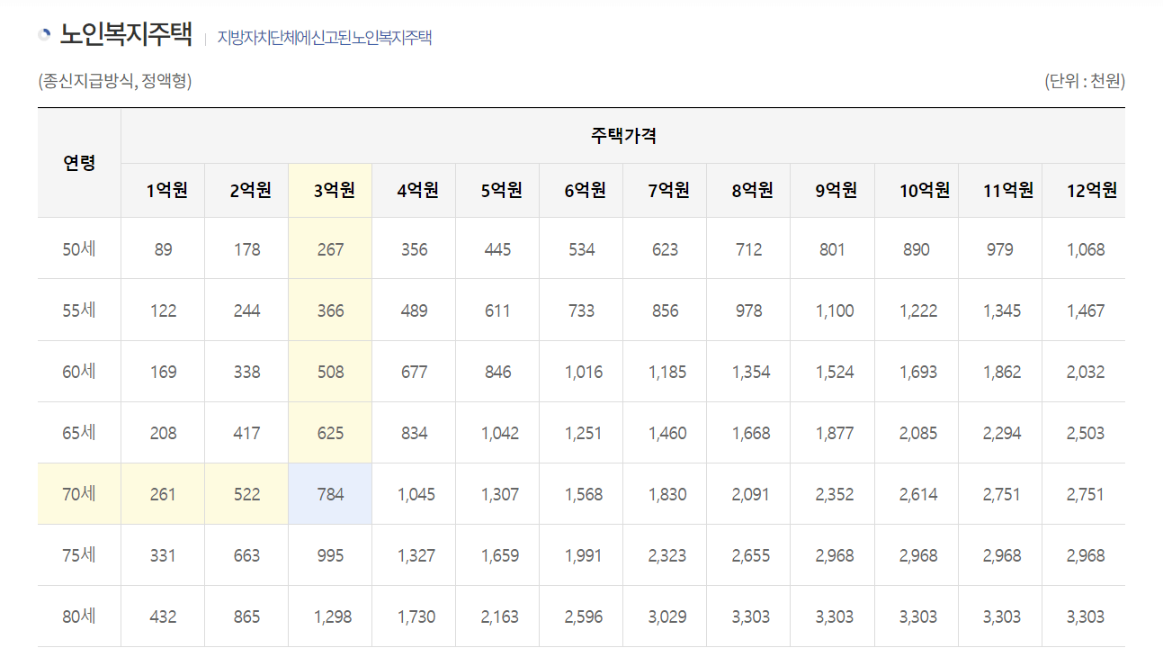 예시) 70세(부부중 연소자기준) 3억 원 주택 기준→매월 78만4천원 수령