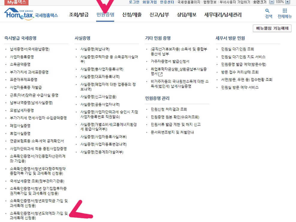 민원증명에서 소득금액확인서 발급 후 확인