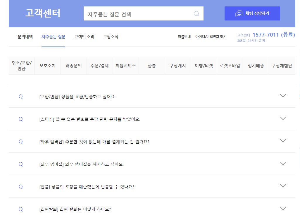 쿠팡 자주 묻는 질문 찾기