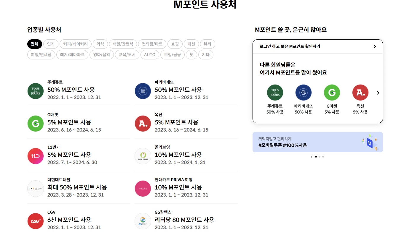 가장 인기있는 M포인트 사용처는 뚜레쥬르, 파리바게뜨, G마켓, 옥션입니다.