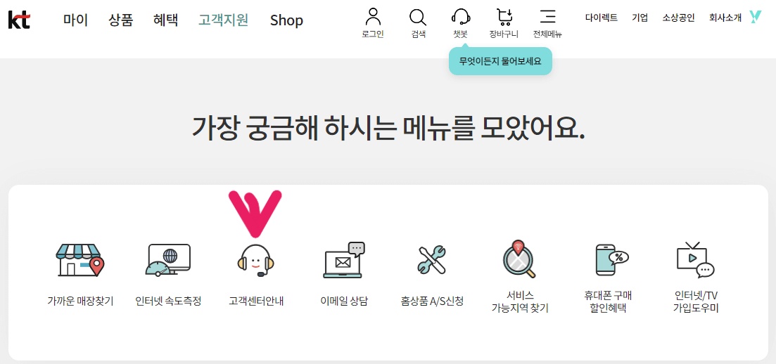 고객센터안내뿐만 아니라, kt 이용자가 가장 궁금해하는 사항들이 한 곳에 모아 둔 곳이라 편리하게 이용할 수 있습니다.