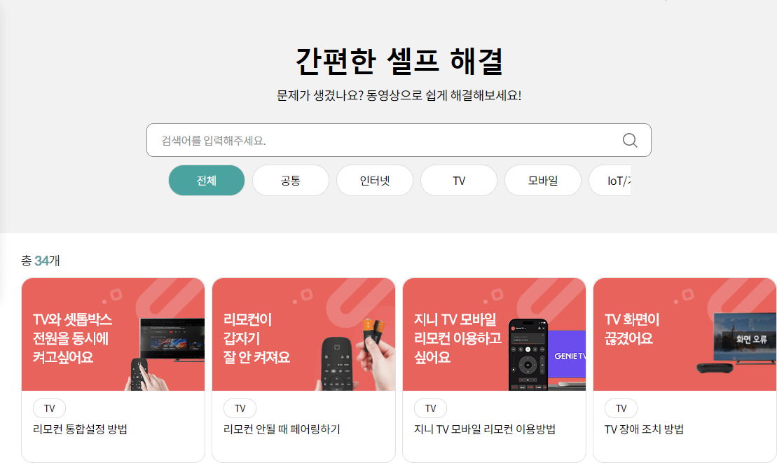 모바일기기, tv기기, 인터넷기기 등에 문제가 생겼을 때, 짧은 동영상을 보며 간편하게 해결할 수 있습니다.