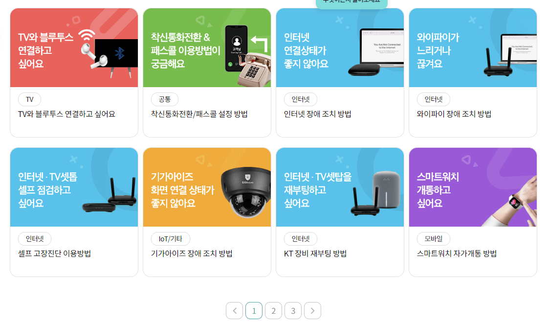 kt 홈페이지에서는 위에서 처럼 간단하게 해결할 수 있는 셀프 해결 동영상 서비스를 제공하고 있습니다.